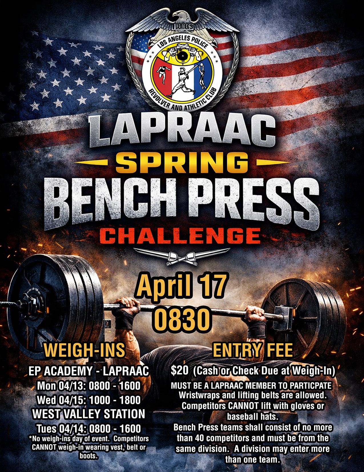 LAPRAAC’s Mission is to encourage the highest level of professional law enforcement skills by providing athletic, educational, marksmanship, physical fitness, facilities, recreation and social activities to benefit all members of the Los Angeles Police Department.